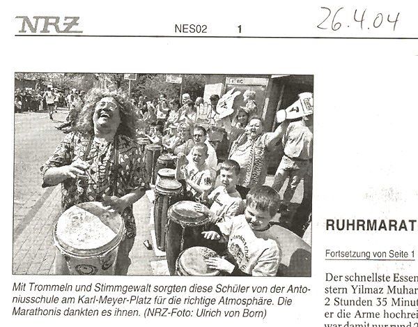 Haltestelle Karl-Meyer-Platz (Schonnebecker Marktplatz). Am Morgen kamen zuerst die Inline-Skater. Der erste Marathonläufer lief um 11.56 Uhr an uns vorbei. Wir haben auf 24 großen Congas getrommelt! Die Stimmung war großartig! 2005 am 17. April beim 3. Ruhrmarathon waren wir wieder mit Daniel Bazanta dabei!